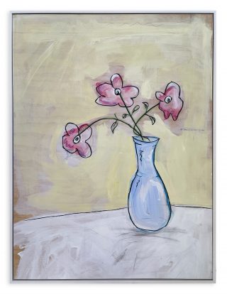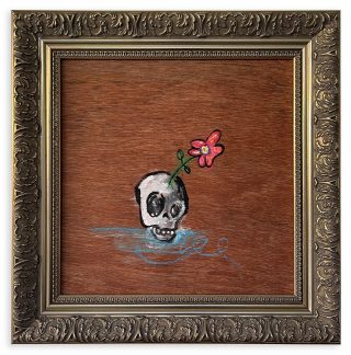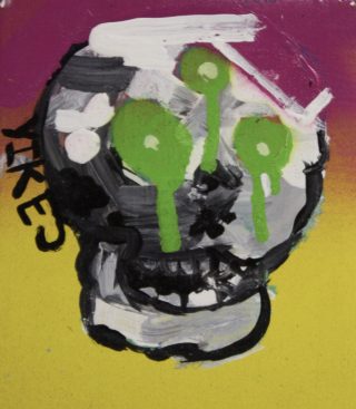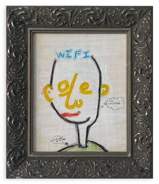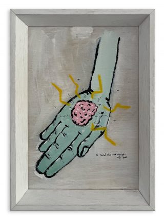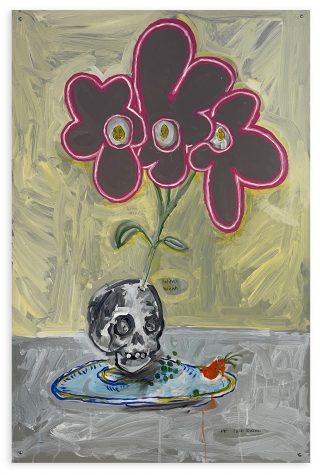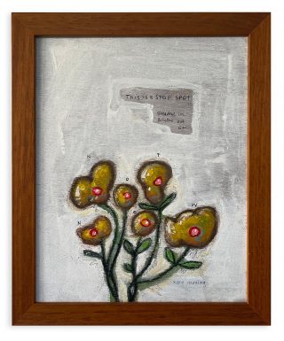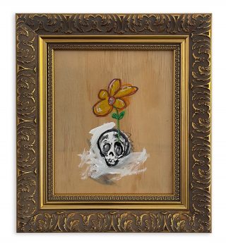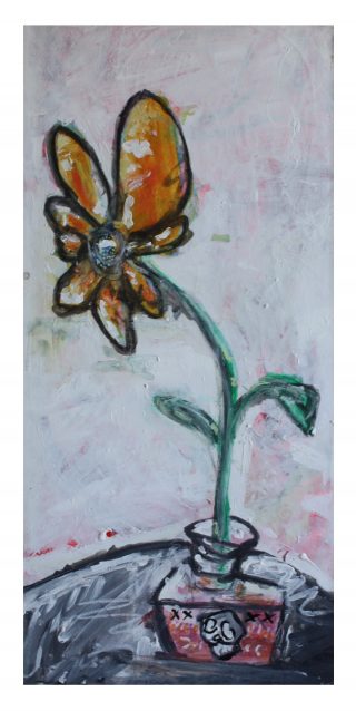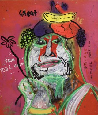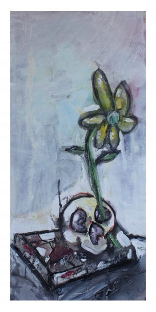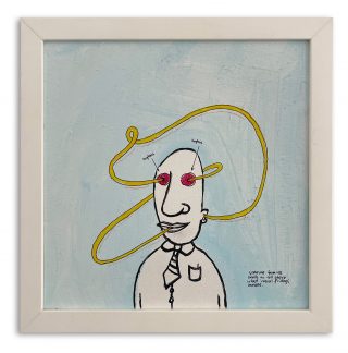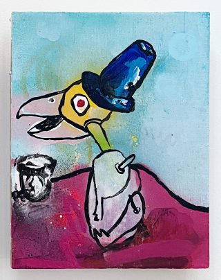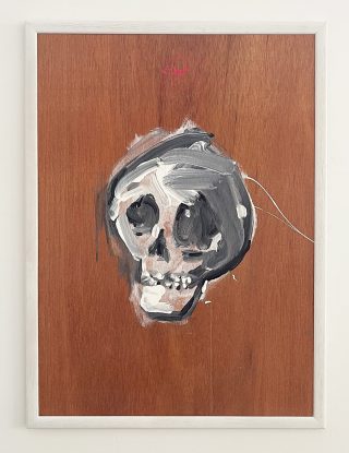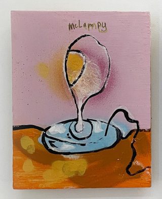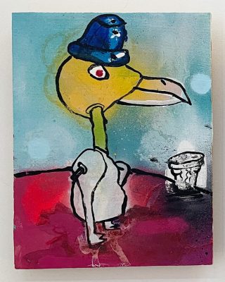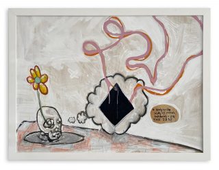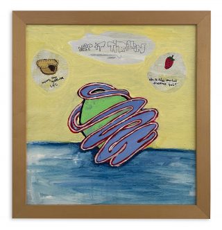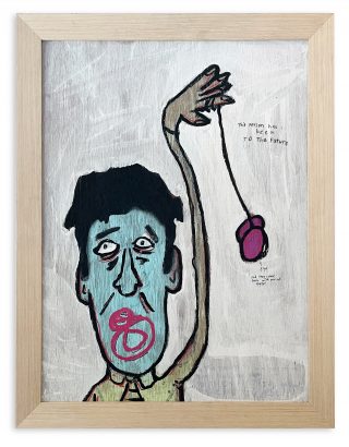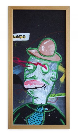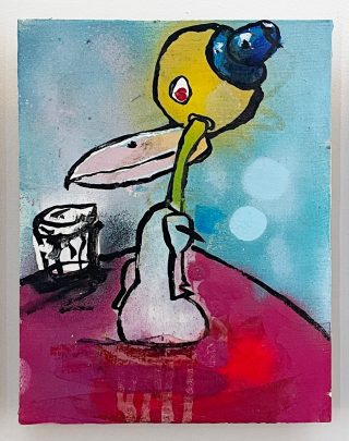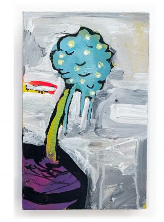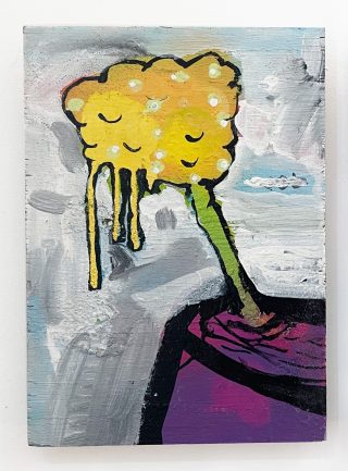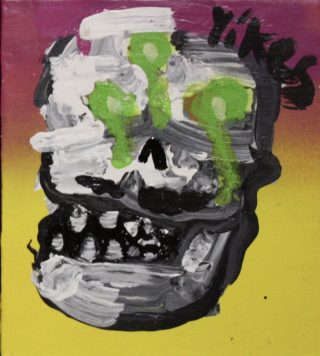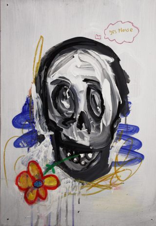 Henry Wexler’s practice centres around everyday life, absurdity, the mundane, humour, and constant consideration of the flux between life and death. Wexler’s work plays with and somewhat mocks the ideals of art and the artist. The romantic notion of the artist slaving over a painting is not apparent here. Wexler works frantically, on dozens of pieces at a time. Using a heat gun helps to speed up the build of layers of whatever media is at hand. In Wexler’s words, it is “Cartoonish, slack. Shitty really, but hopefully uplifting.”