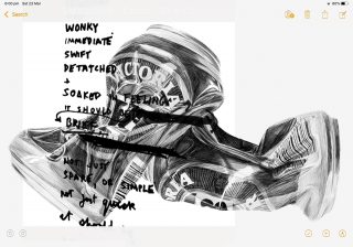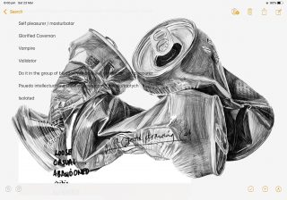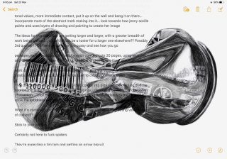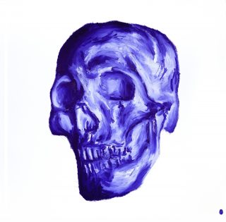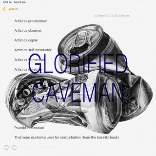 ‘Artist As…’, explores the implications surrounding the cultural landscape, symbolism, and particularly the masculine, tropes of artists in Australia. Utilising a visual vocabulary and stereotypical symbolism to exploit the idea of the valued Australian landscape artworks; the crushed beer can becomes a cultural landscape. Sherington adds humour, self-deprecation, philosophy and stereotype by means of crudely-sprawled statements in ultramarine blue across the finely drawn still life cans. Ultramarine blue, associated with Australian artists such as Whiteley and as seen on the Australian flag, becomes a catch-all for the Australian Palette.