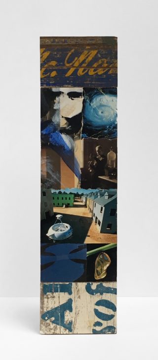 Tin, printed material, acrylic on hardboard and card