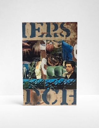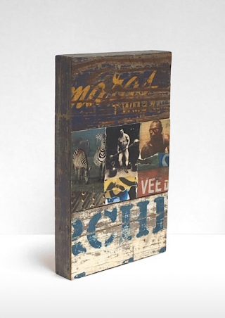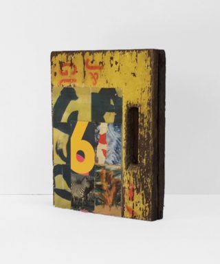 Wood, printed matter, acrylic on paper