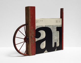 Wood, acrylic on paper, string, printed material