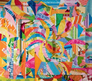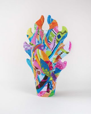 Sandy Raku clay, acrylic paint, vintage textiles & sealant