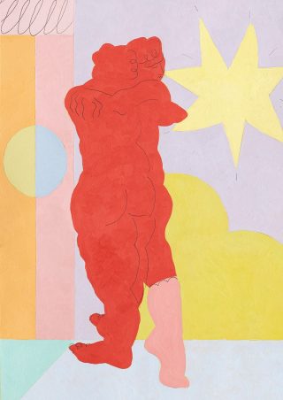 In Frances’ work, she subverts this dynamic and often places herself in the role of ‘observed muse’. She references herself, her partner and her friends mimicking acts of daily pantomime — of partnered performance, self-monitoring and introspection — the disco of our social roles.