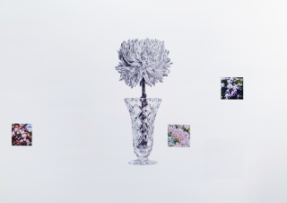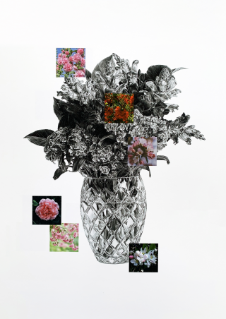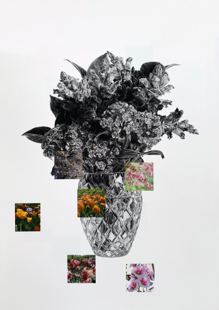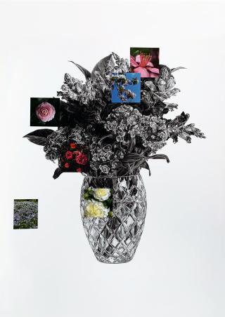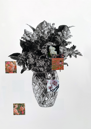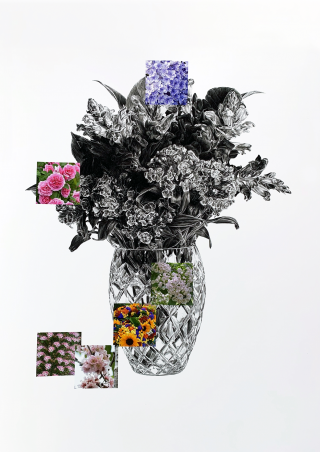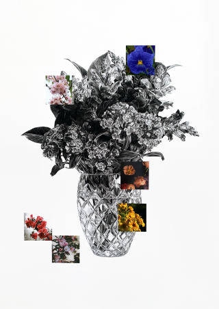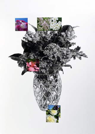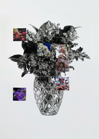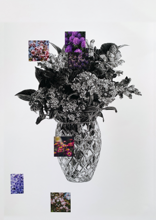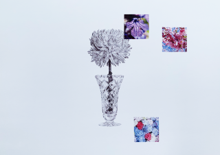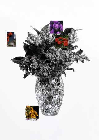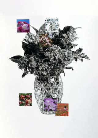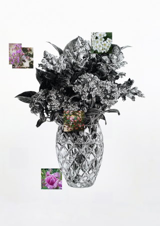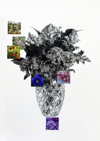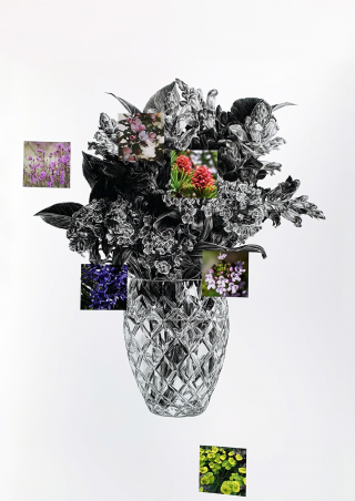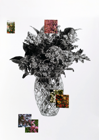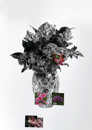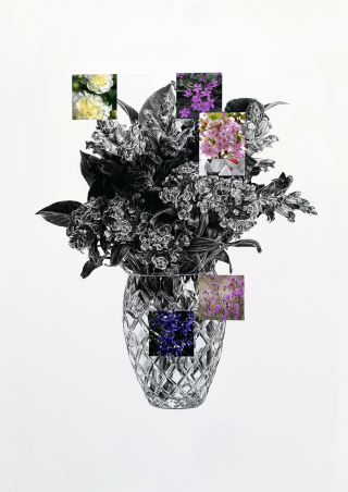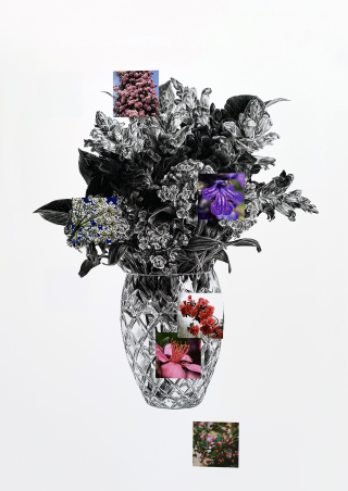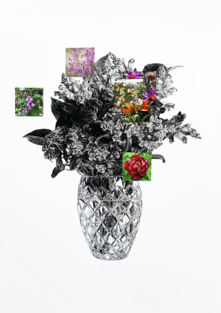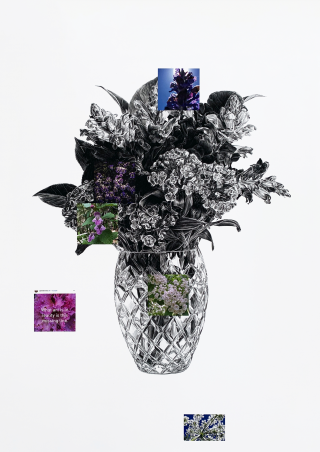 Gathering images from #flowers on Instagram, Sherington engages with the ubiquitous nature of the images which appear in the search. Sherington facilitated the creation of a random image generator which uses code to discern which image is placed over the framework of a still-life vase drawing. A collaboration of artist, machine and social framework, the result is a representational compression of time, experience, location, and memory. Refreshing every 28 seconds, Sherington alludes to the average viewing time of Gallery artwork. Each artwork is created on the refreshing of the algorithm and is not a pre-made image.