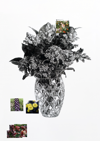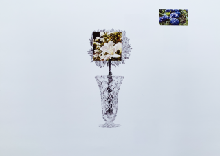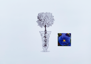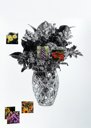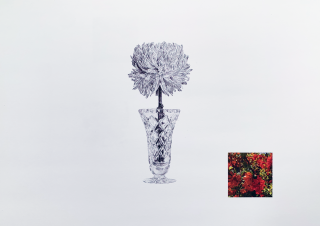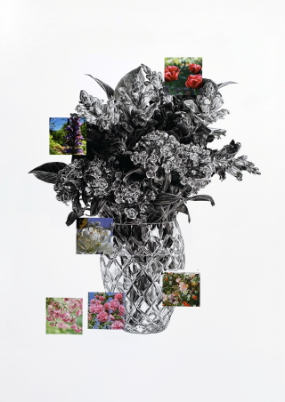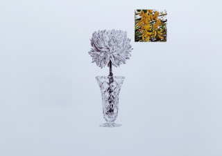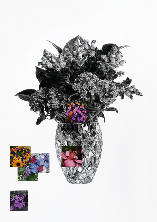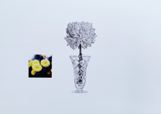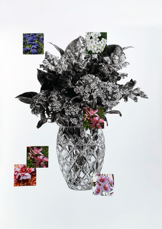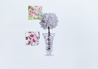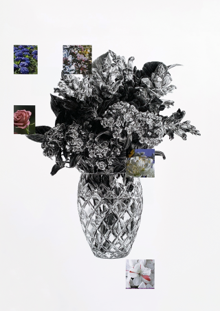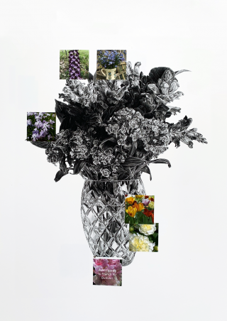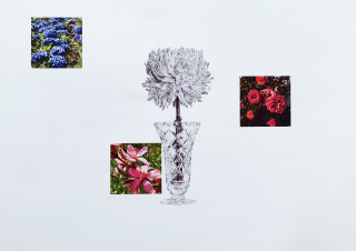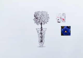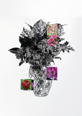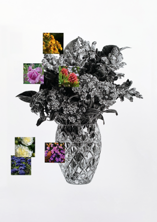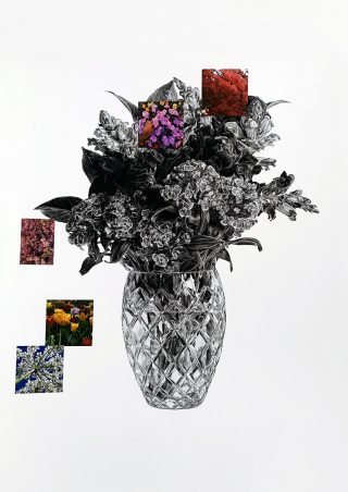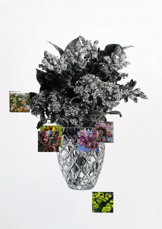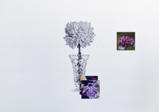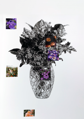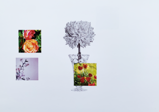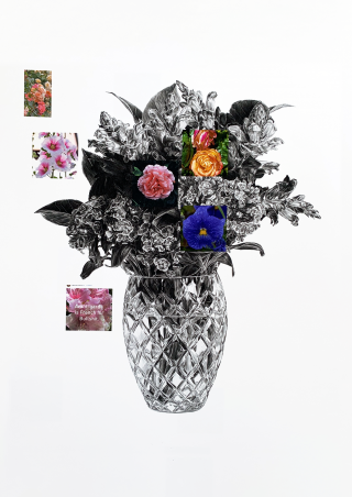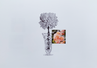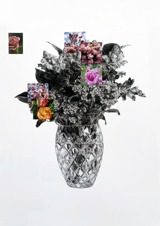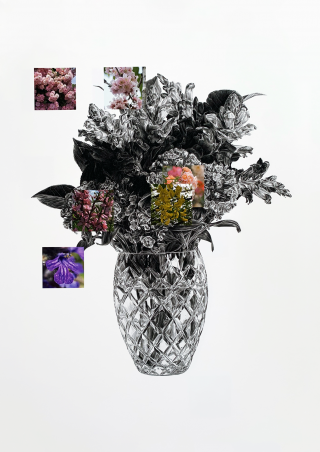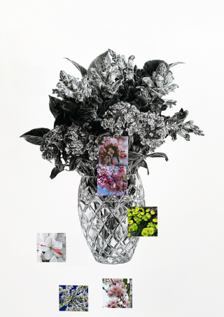 Gathering images from #flowers on Instagram, Sherington engages with the ubiquitous nature of the images which appear in the search. Sherington facilitated the creation of a random image generator which uses code to discern which image is placed over the framework of a still-life vase drawing. A collaboration of artist, machine and social framework, the result is a representational compression of time, experience, location, and memory. Refreshing every 28 seconds, Sherington alludes to the average viewing time of Gallery artwork. Each artwork is created on the refreshing of the algorithm and is not a pre-made image.
