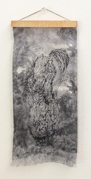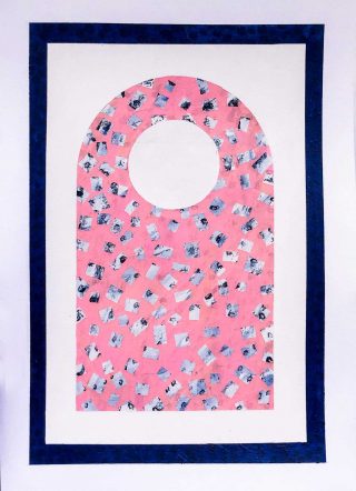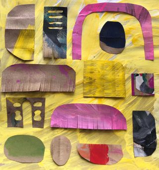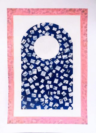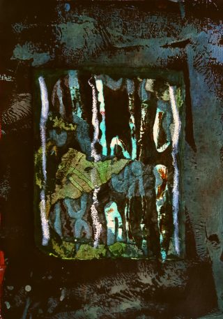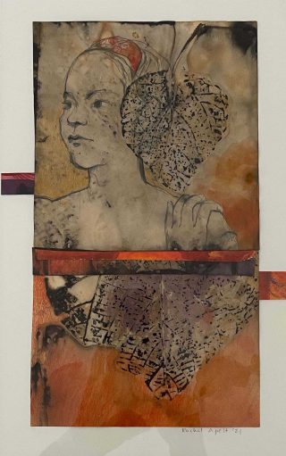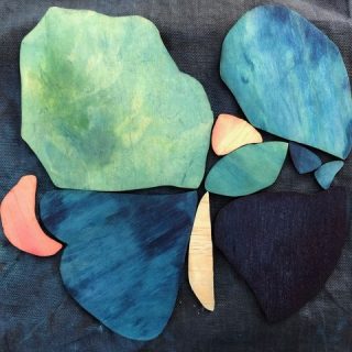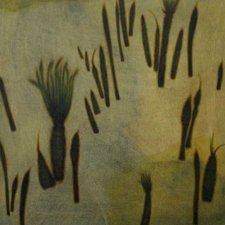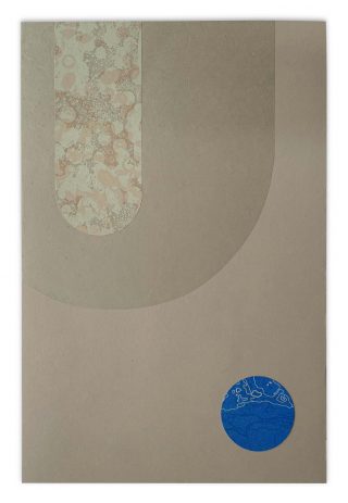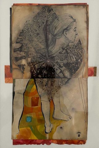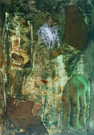 Macaranga tanarius leaf ecoprints on life drawings (on AF cartridge), collaged fragments from older work. Graphite, gouche, ink, coloured pencil.