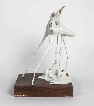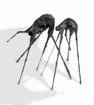 Steel rods, antler pieces, glass spheres, ink, epoxy clay, taxidermy foam form