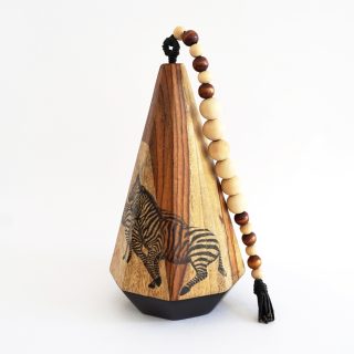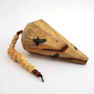 Ink, leather, beads on wood block