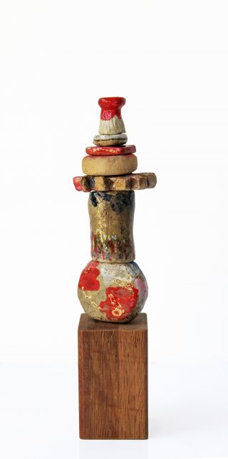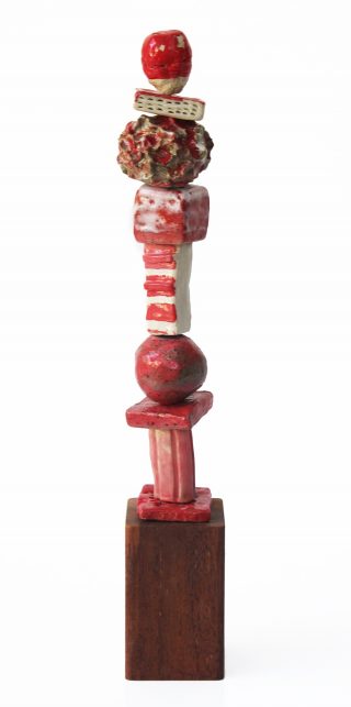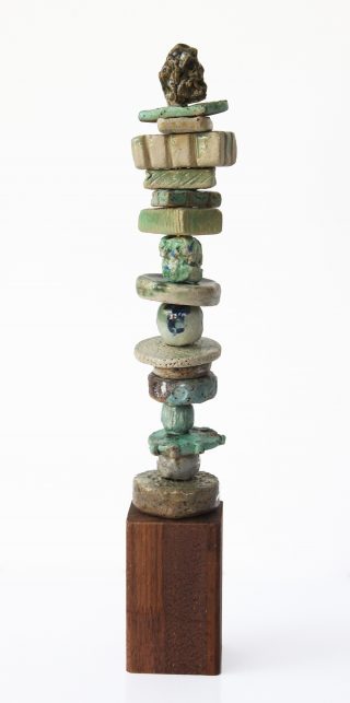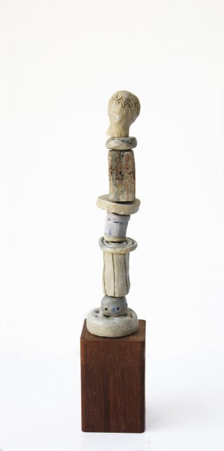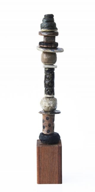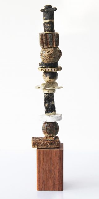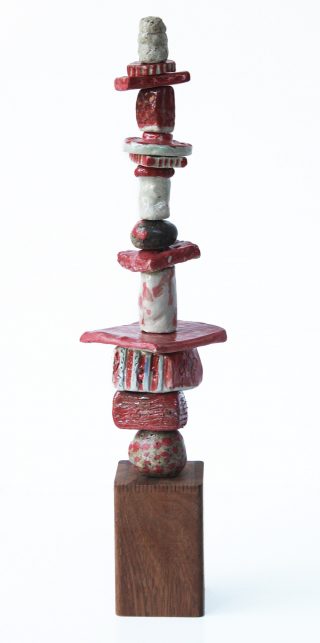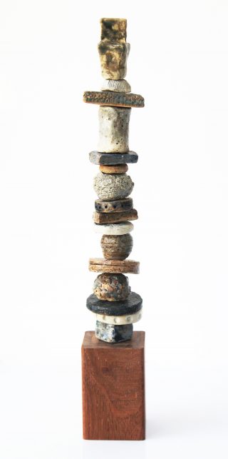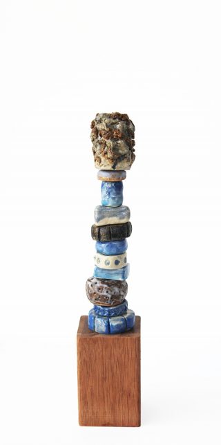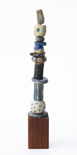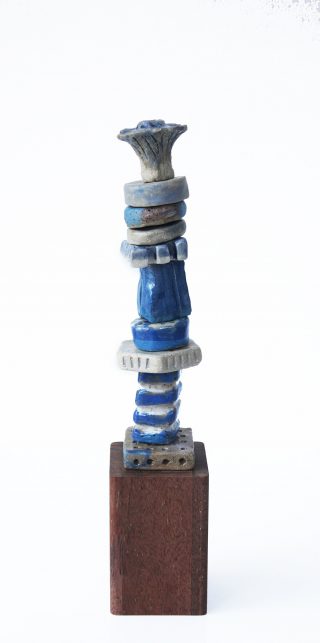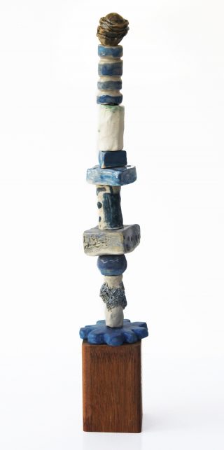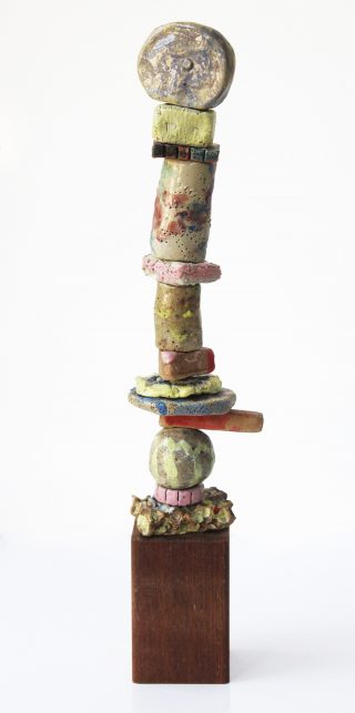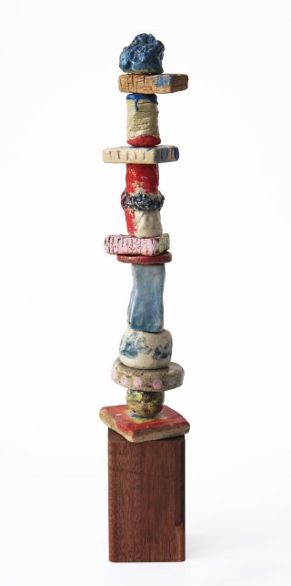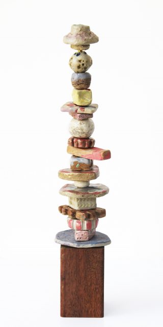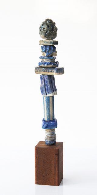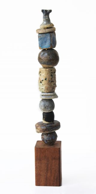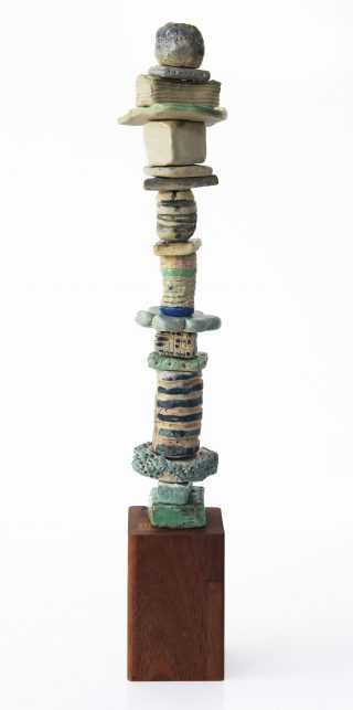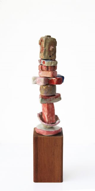 Stoneware clay, various glazes, hard wood stand and brass pole