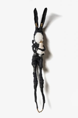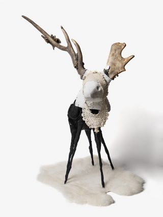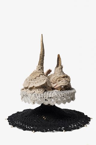 Antler pieces, taxidermy foam form, epoxy clay, ink, pastel primer, flocking, sheep leather, handmade epoxy clay clusters, glass beads, pearl beads, glass spheres, crochet thread, reconstructed doily, upholstery thread, rabbit pelt, steel rods