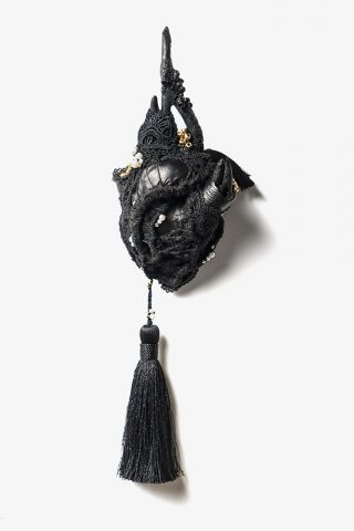 Sheep leather, crochet thread, upholstery thread, felt, ink, Guipure Lace, dyed doily, clay clusters, glass beads, pearl beads, glass spheres, epoxy clay antler pieces, gold powder, tassel