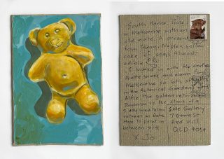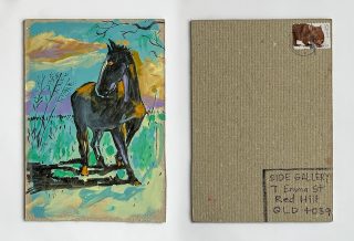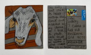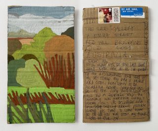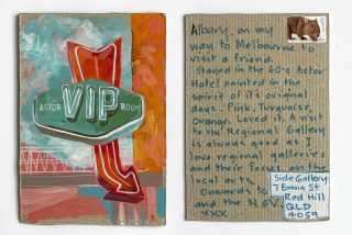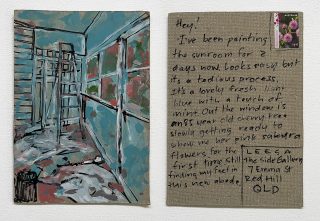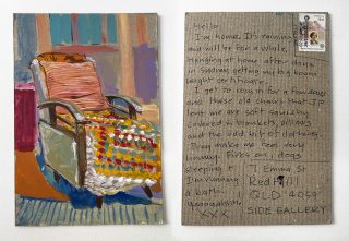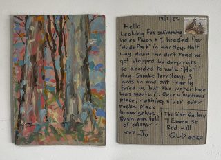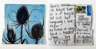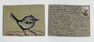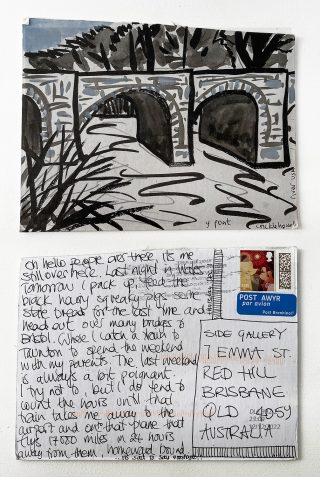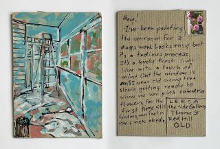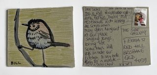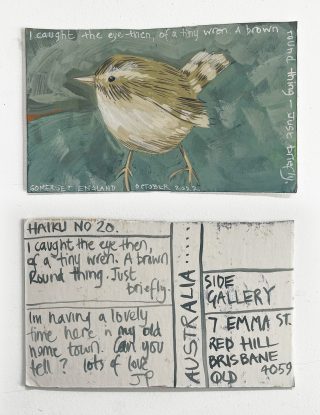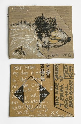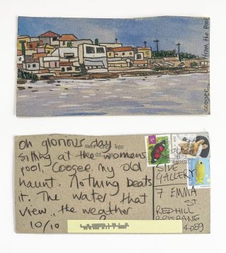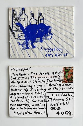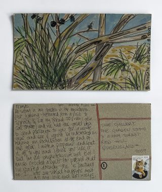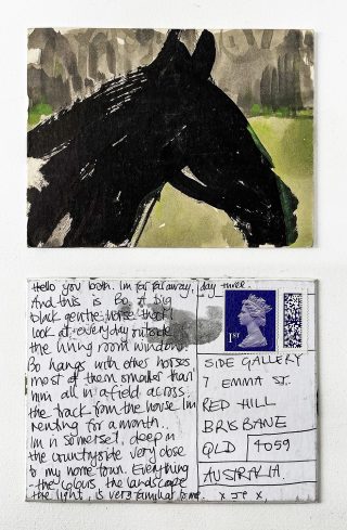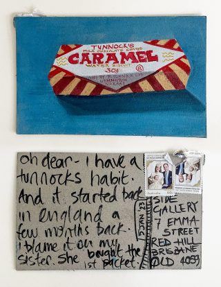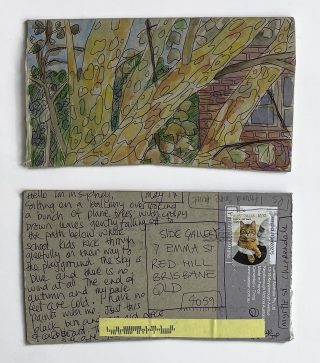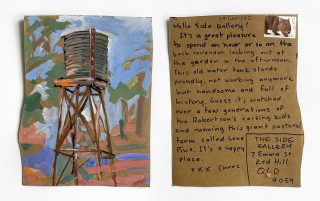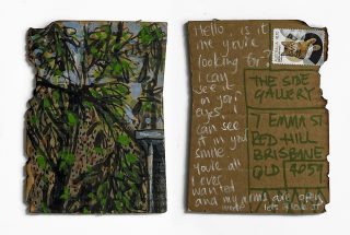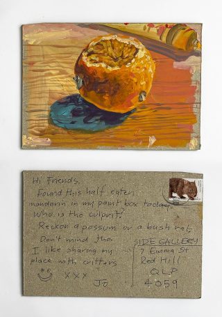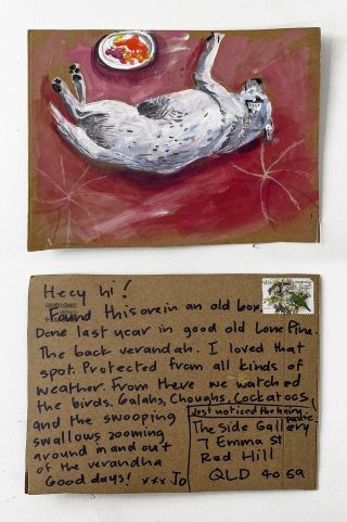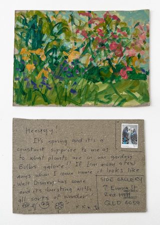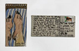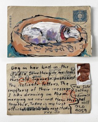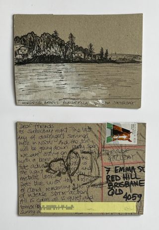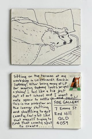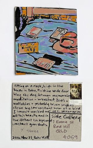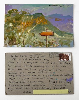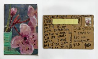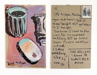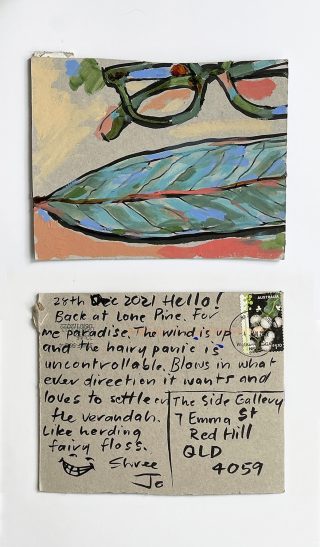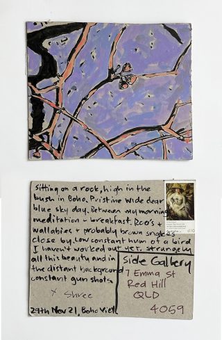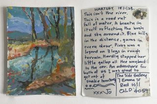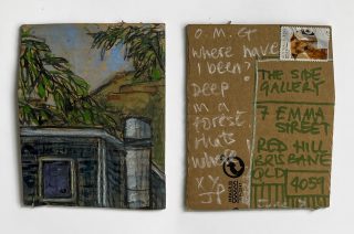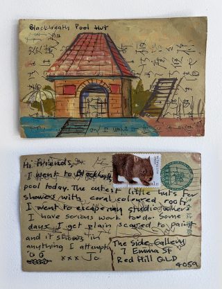 The subject matter of the tiny art pieces varies but generally is consistent with the artist's natural environments. Julie and Jo live in the Blue Mountains, surrounded by World Heritage wilderness. Their home life seems idyllic; warm fires, cabin life, an abundance of natural surroundings and the very type of place I would go for a holiday to soak up all that serenity. So it is no wonder their handmade postcards, with snippets of painted still life scenes, pets, people, and their natural environmental surroundings, are like glimpses of a romanticised vacation. Indeed, Julie even sent us postcards from her trip to the UK...