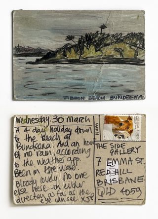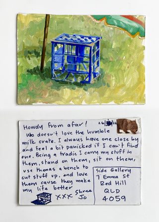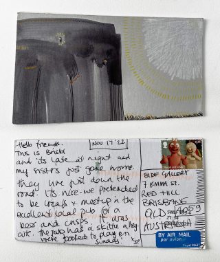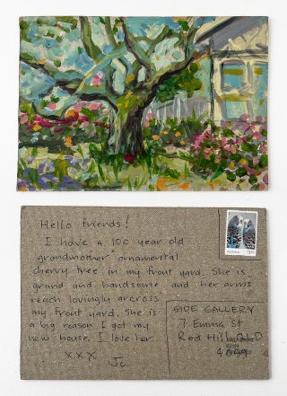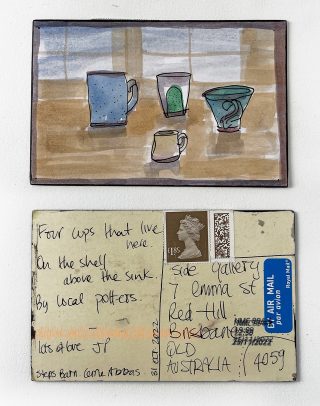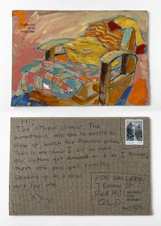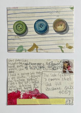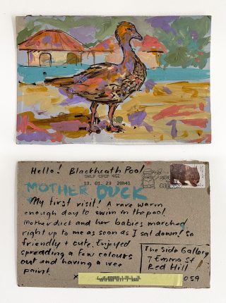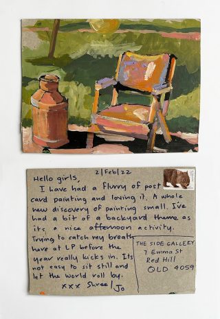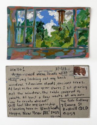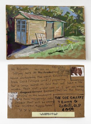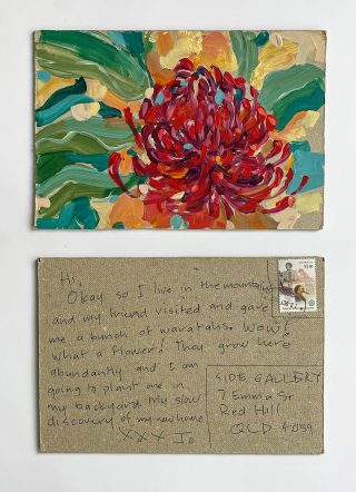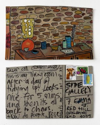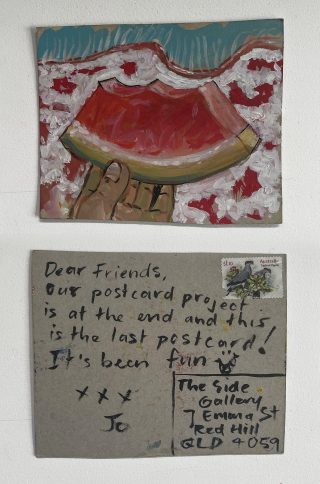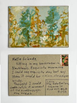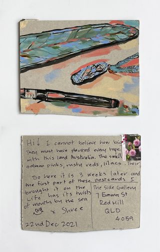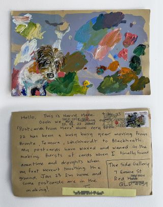The small, handmade works of art acquired by snail mail forced us to take a breath and reflect on distance, connection, and creative practice and have connected us in the slow pleasure of waiting. The genuine connection of receiving a handmade postcard, painted and sent with intention, that has travelled and found its way to you is hard to explain; it is almost akin to appreciation and relief. Whatever it is, I now understand it is worth the wait.