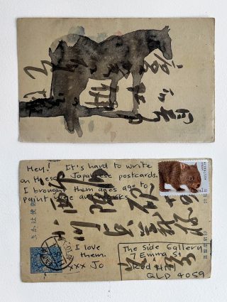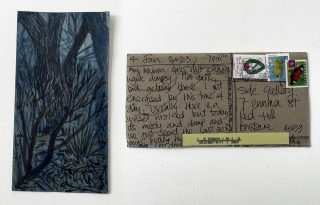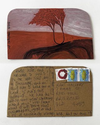 Both accomplished interdisciplinary artists, the pair proposed to send postcards to the gallery all year and, in 2023, exhibit the body of work as a whole. The process and logistics alone were fascinating; we could watch the artists creating a daily and weekly creative practice ritual and keep up to date with their latest creative endeavours. We received about two weekly postcards at the gallery last year; at the last count, we received just over 100 postcards.