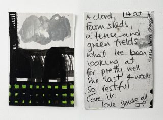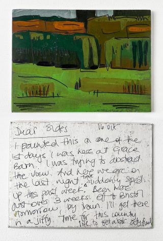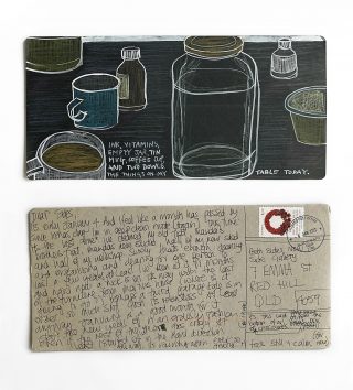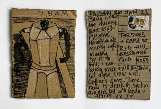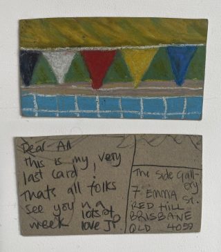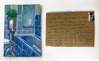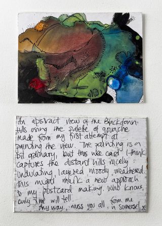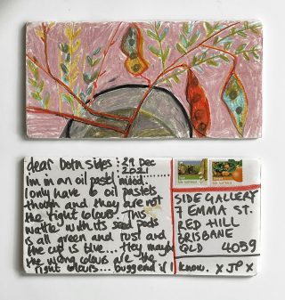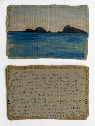 Julie and Jo consistently reused, found and made materials to create their postcard substrates to write and paint on. Doing so is a link to their professional practices; It is vital to note the considered nature of the project and appreciate the link to the wabi-sabi and imperfection celebrated in their creative practices.