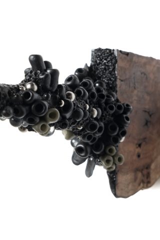 Epoxy clay, glass spheres, pearl beads, gold beads, ball bearings, upholstery thread, Ovis aries rib, flocking, reclaimed timber