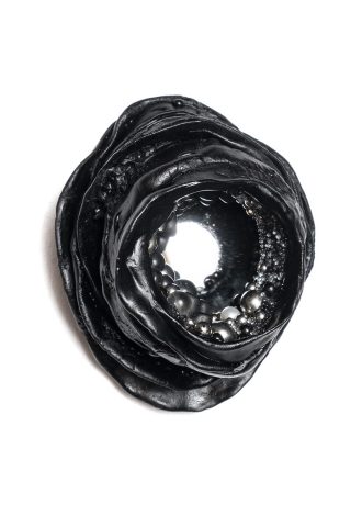 Epoxy clay, glass spheres, pearl beads, gold beads, ball bearings, upholstery thread, felt, Ovis aries leather, Bos taurus thoracic vertebrae, flocking, ink