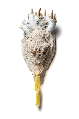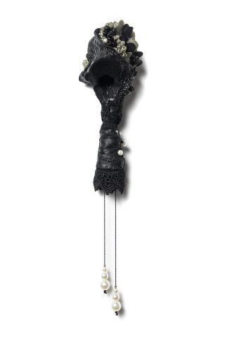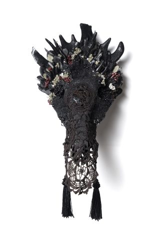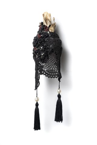 Epoxy clay, doilies, glass spheres, pearl beads, gold beads, ball bearings, upholstery thread, quartz crystals, antler fragments, Ovis aries skull cap, ink
