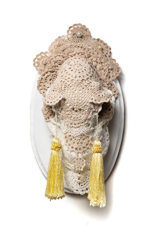 Epoxy clay, doilies, glass spheres, pearl beads, gold beads, upholstery thread, Ovis aries skull, tassels, 22 karat gold leaf, iridescent medium, oval pine plaque, ink