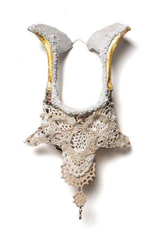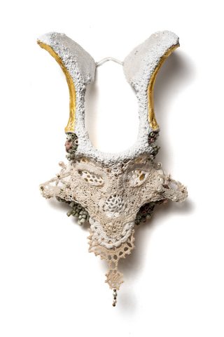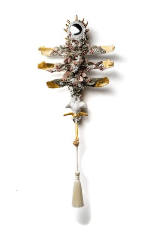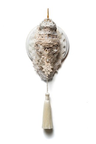 Epoxy clay, doilies, glass spheres, pearl beads, gold beads, upholstery thread, Ovis aries pelvic bone, 22 karat gold leaf, iridescent medium, ink