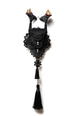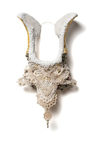 Epoxy clay, doilies, glass spheres, pearl beads, gold beads, upholstery thread, Ovis aries pelvic bone, antler pieces, quartz crystals, tassels, ink