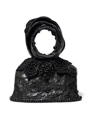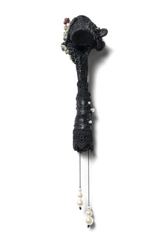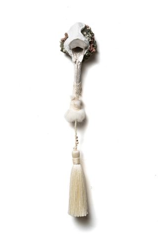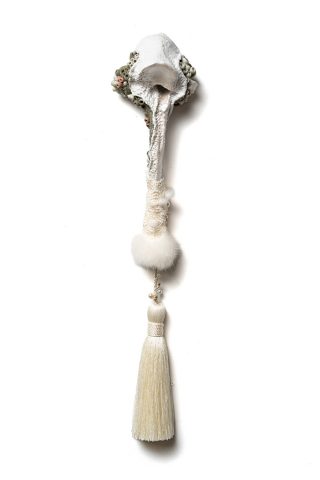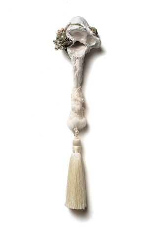 Epoxy clay, Ovis aries tail bone, porcelain hand, Oryctolagus cuniculus domesticus skull, Ovis aries tail bone, Ovis aries thoracic vertebrae, Ovis aries leather, doilies, glass spheres, pearl beads, gold beads, ball bearings, upholstery thread, tassel, ink