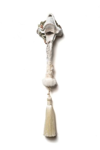 Epoxy clay, glass spheres, pearl beads, gold beads, ball bearings, upholstery thread, Oryctolagus cuniculus pelt, Bos taurus thoracic vertebrae, flocking, tassel, iridescent medium