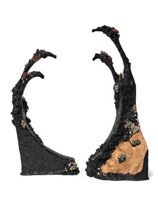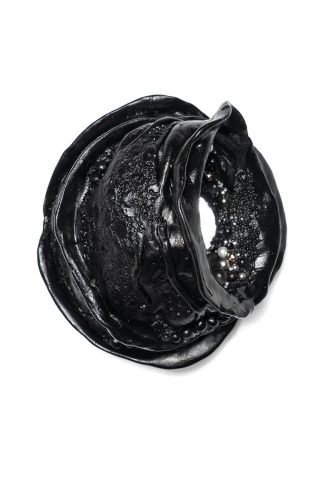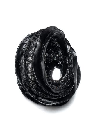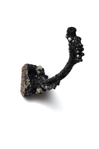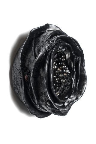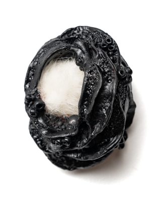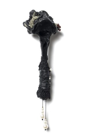 Epoxy clay, glass spheres, pearl beads, gold beads, ball bearings, upholstery thread, Ovis aries rib, flocking, ink