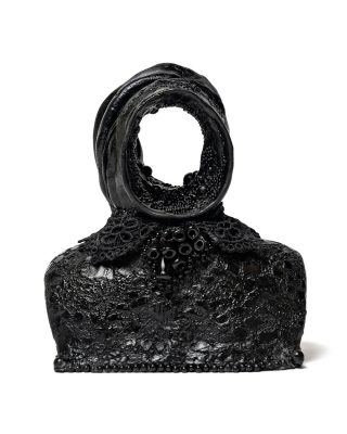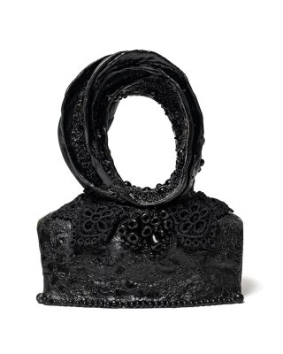 Epoxy clay, lace, upholstery thread, glass spheres, gold beads, porcelain doll bust, ink *Hand embellished mirror – Not shown