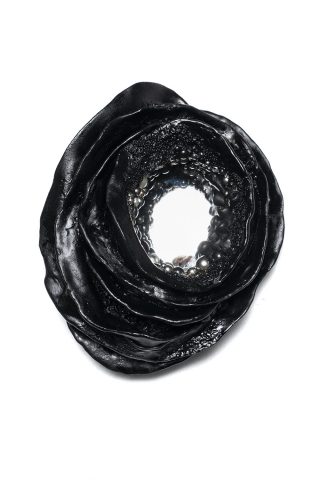 Epoxy clay, porcelain doll bust, glass spheres, pearl bead, gold beads, ball bearings, convex mirror, reclaimed timber, ink. *Hand embellished mirror – not shown