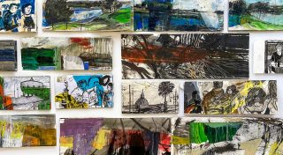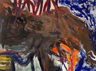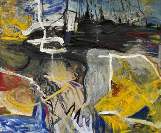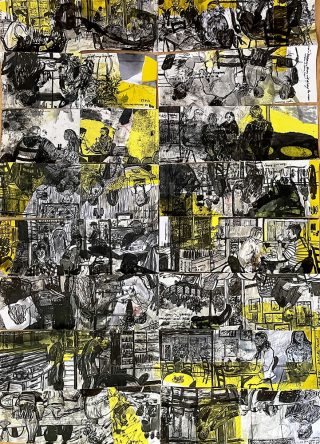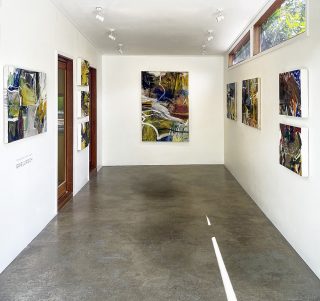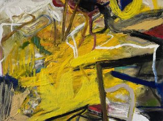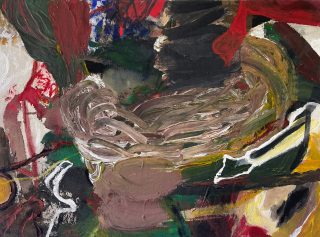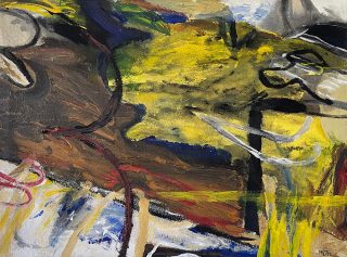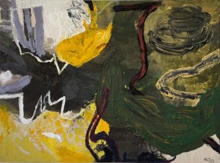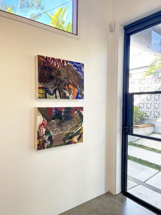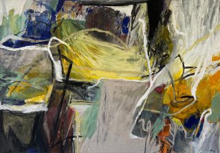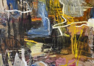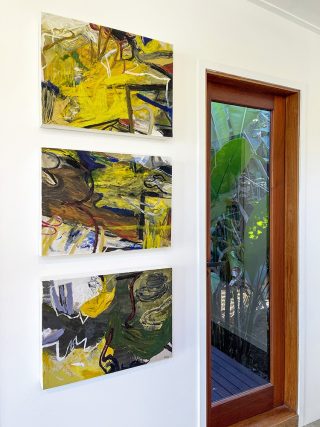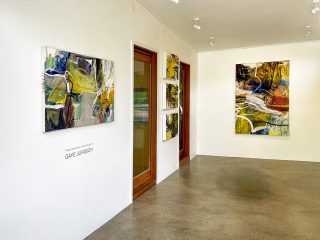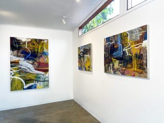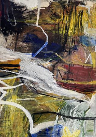 Public places private thoughts is a small body of work that continues to explore abstracted narratives that have been part of Gaye's creative oeuvre and exploration for several years. Gestural marks paired with sharp and organic edges of shapes marry the composition and mix jarringly with the artist's intense use of colour. Earthy, natural and vibrant hues are smashed together in deliberately gestural marks to create an instinctually visceral body of work.