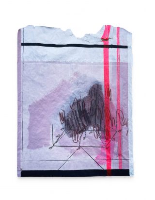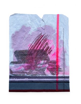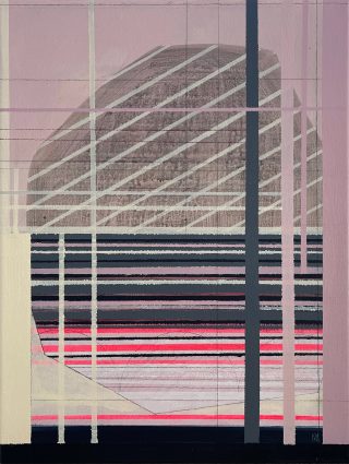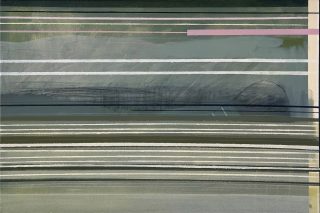 The use of colour outside of the previous monochromatic and muted palette of Horton’s previous work is a new development, also. In Still Line, we see the use of neons alongside a new (albeit subdued) palette of pinks, greens, browns and blues. Horton states that these new works acted as a meditative performance removed from the purpose and content, abstract and playful in its creation.