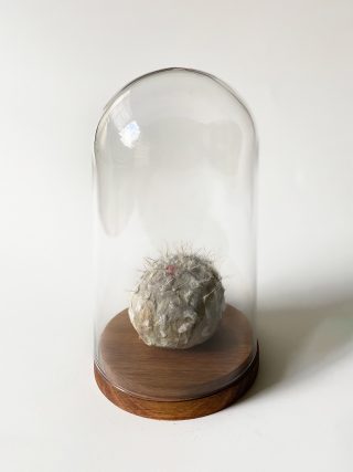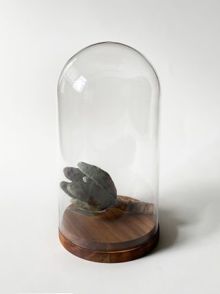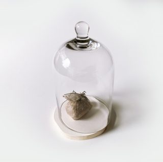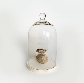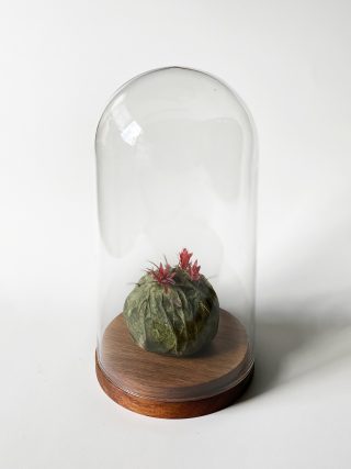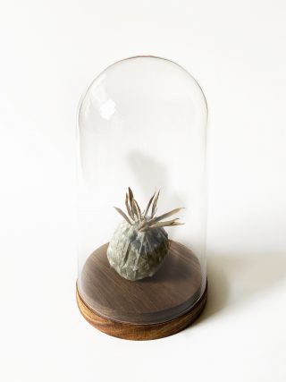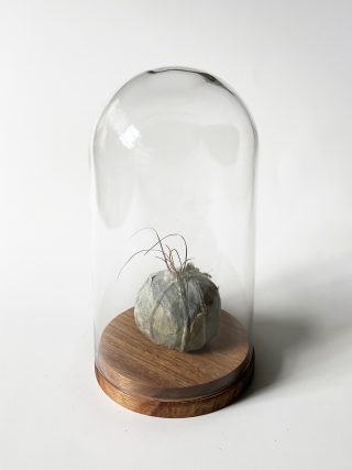 Recycled paper, glass bell jar with wood base
