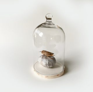 Paper and wood and thread with glass dome