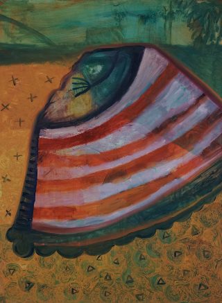 The exhibition’s title came from a whimsical thought, but after some research, I discovered the moon actually has a tail. This revelation amused me and speaks to the unseen connections in the world, in each other, and in the universe. My paintings often attempt to surface these elusive connections; this body of work is no exception.