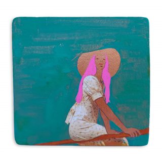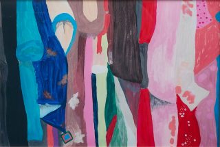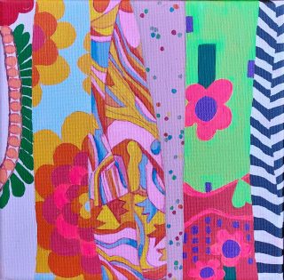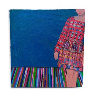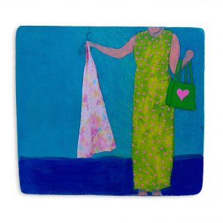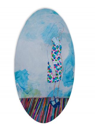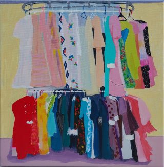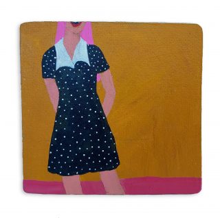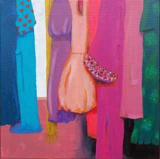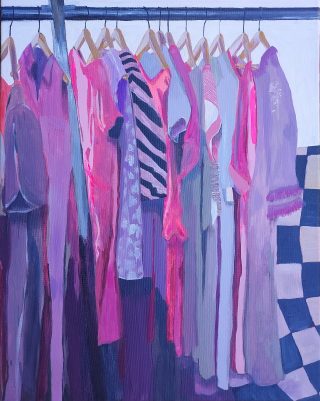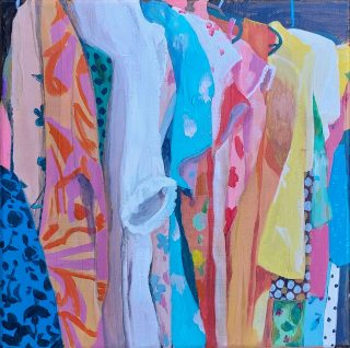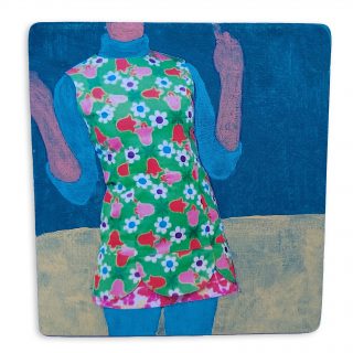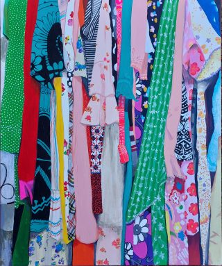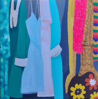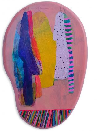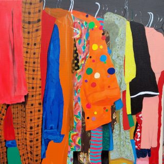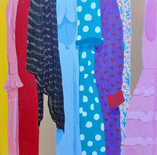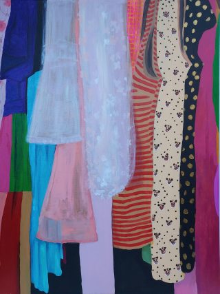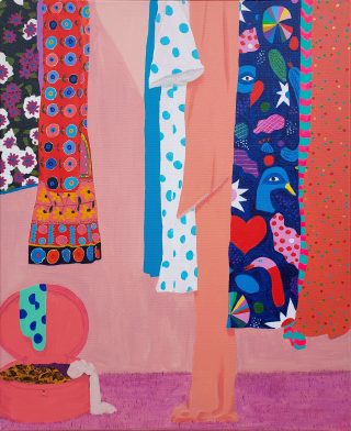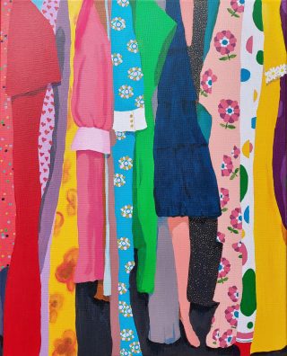 Vibrant colour, bold forms and clashing patterns embody the latest series of works by Melanie Brady. True to the artist’s oeuvre, the pieces depict the vintage fashion-inspired subject matter. We glimpse the connection when a garment is precious to its owner in a playful, nostalgic, vibrant style.