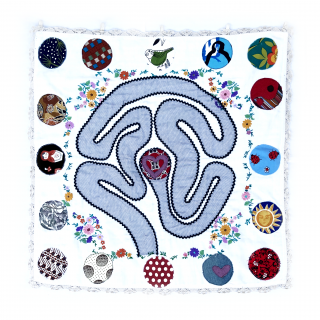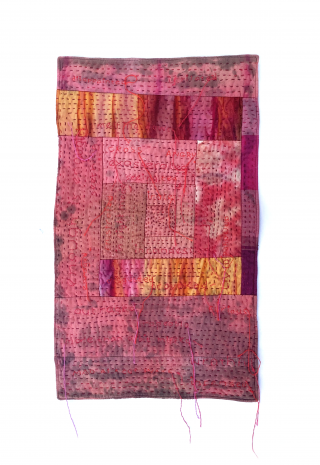 dyed cotton fabric, quilted and slow stitched, with embroidery text