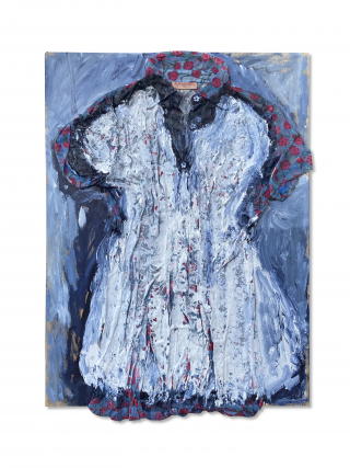 Copy of photographic image of painted dress (acrylics) on fabric, lit by green light
