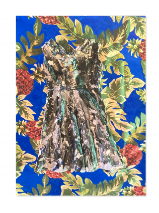 Deb Sara — Paper copy of photograph of painted dress on fabric with green light and gouache 2021