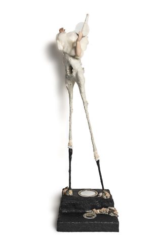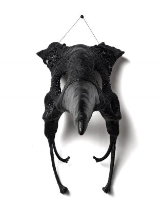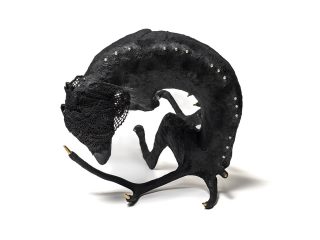 Taxidermy foam form, steel rods, epoxy clay, cow rib bones, ink, pastel primer, pearl beads, half pearl beads gold beads, hand formed epoxy clay embellishments