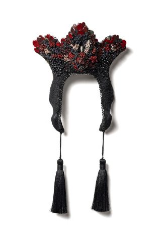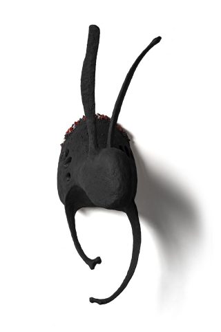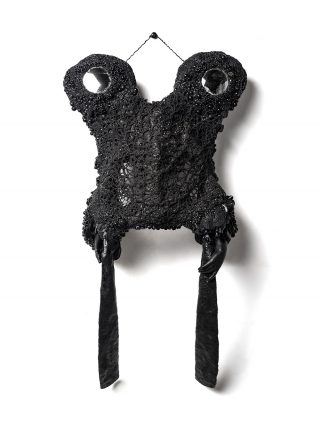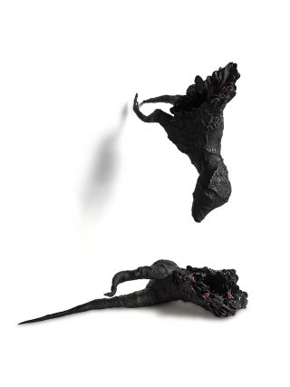 Crafted primarily in black, each piece is punctuated with vibrant accents—garlands, buds, openings, and floral motifs—that subtly disrupt conventional perceptions of material and form. These substantial structures invite intimate, hands-on engagement, encouraging viewers to connect with their weight, texture, and presence. By initiating this sensory experience, Watson invites reflection on the nuanced emotional and sensory dimensions that emerge within the shared space of art, challenging and enriching the viewer’s relational experience with each piece.