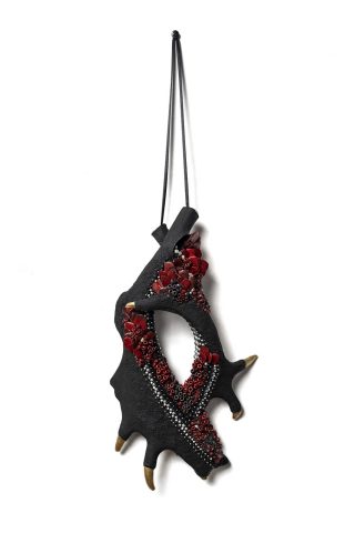 Antler pieces, epoxy clay, porcelain spheres, stainless steel spheres, hand formed epoxy clay embellishments, ink, pastel primer, acrylic resin fake teeth, glass spheres, gold beads, half pearl beads, ribbon, tassel
