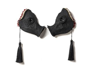 Cow pelvis bone, epoxy clay, convex mirrors, stainless steel spheres, hand formed epoxy clay embellishments, ink, pastel primer, acrylic resin fake teeth, glass spheres, gold beads, half pearl beads, tassels