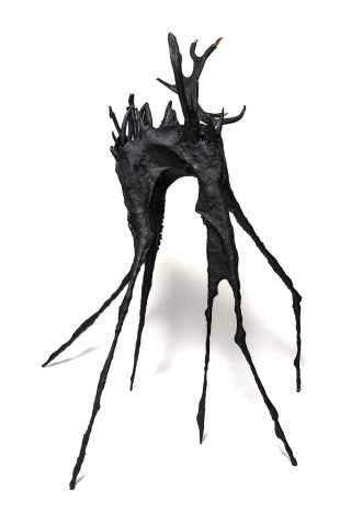 Taxidermy foam form, steel rods, epoxy clay, antler, antler tips, sheep bone, doilies, lace, upholstery thread, ink, pastel primer, pearl beads, gold beads, flocking
