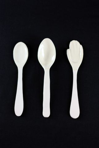 A significant aspect of the Dessert series are Willing’s dinnerware and utensils, specifically designed to heighten the eater's sensorial and emotional responses. Willing’s Mouth Cups, spherical drinking vessels with lip-shaped openings, require the drinker to negotiate a complex movement of kissing, sucking, and slurping to access the sake cocktail contained. Tipping Plate, designed to hold petits fours arranged to achieve balance, playfully visualises the concern one may experience when engaging in the custom of sharing — questioning if one is eating too much or too quickly as the plate starts to tip back and forth. It is these objects that are the focus of With the Table in Mind. Removed from their original functional context, the exhibition allows for these objects to be considered for their own sculptural qualities, revealing Willing’s refined, delicate, and humorous design sensibility.